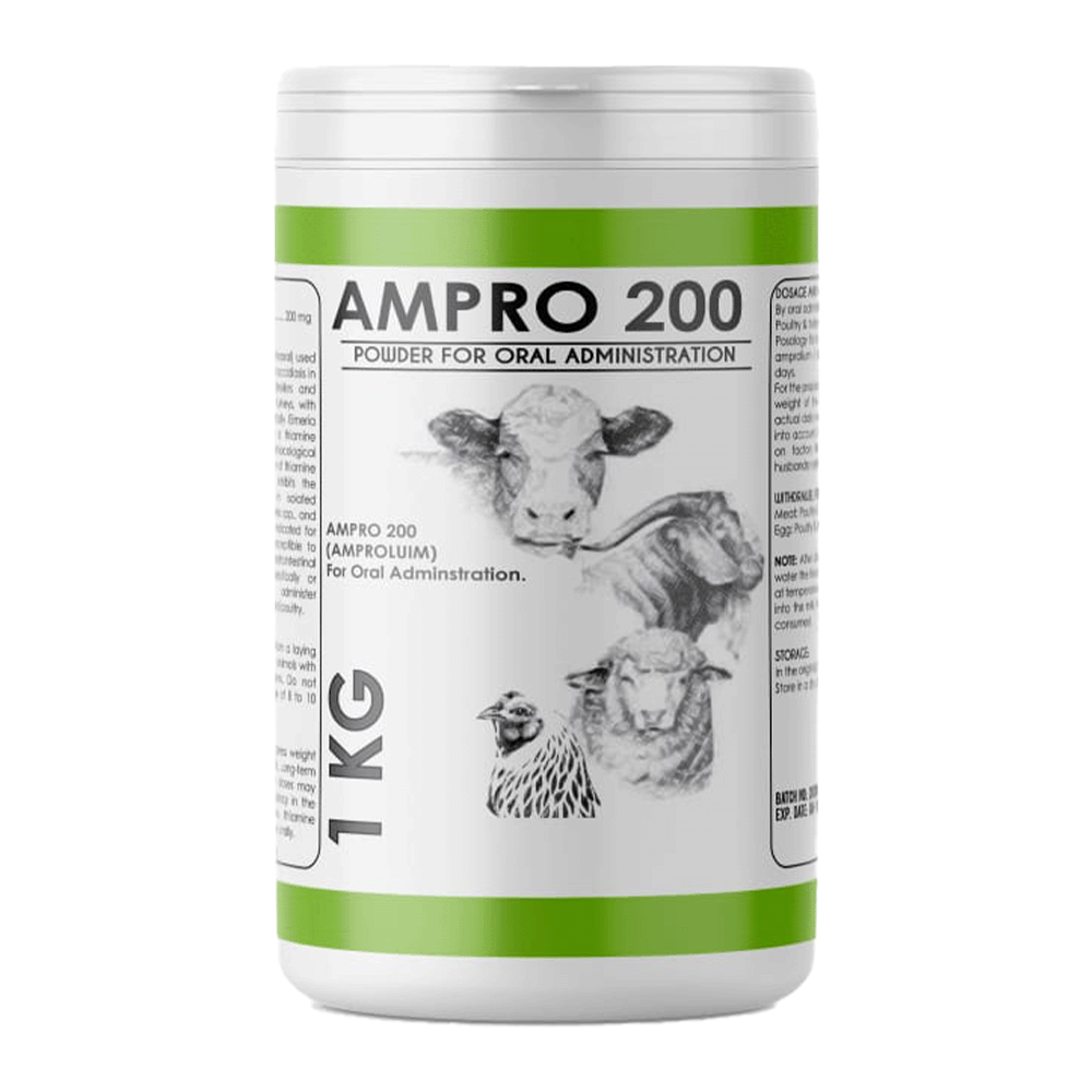 Amprolium competitively inhibits the active transport of thiamine in isolated secondgeneration schizonts of Eimeria spp., and in host intestinal cells. Amprolium indicated for coccidiosis caused by coccidia susceptible to amprolium (Eimeria s.p.p.), or gastrointestinal infections for which it is therapeutically or prophylactically indicated to administer amprolium, in calves, goats, sheep and poultry.