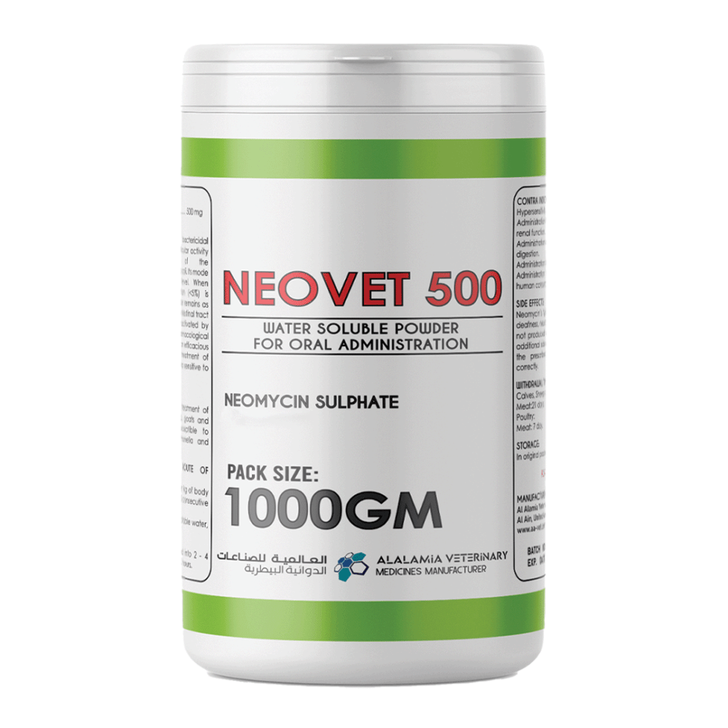 Indicated for the prevention and treatment of bacterial enteritis in calves, sheep, goats and poultry caused by bacteria susceptible to neomycin, such as E. coli, Salmonella and Campylobacter spp.