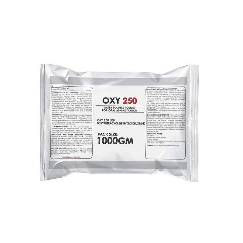 250 mg **Pharmacological Properties:** Oxytetracycline belongs to the tetracycline group and acts as a growth inhibitor against various Gram-positive and Gram-negative bacteria such as *Bordetella*, *Bacillus*, *Corynebacterium*, *Pasteurella*, *Campylobacter*, *Staphylococcus*, *Haemophilus*, *Escherichia coli*, *Salmonella*, and *Streptococcus spp.*, as well as *Mycoplasma*, *Rickettsia*, and *Chlamydia*.