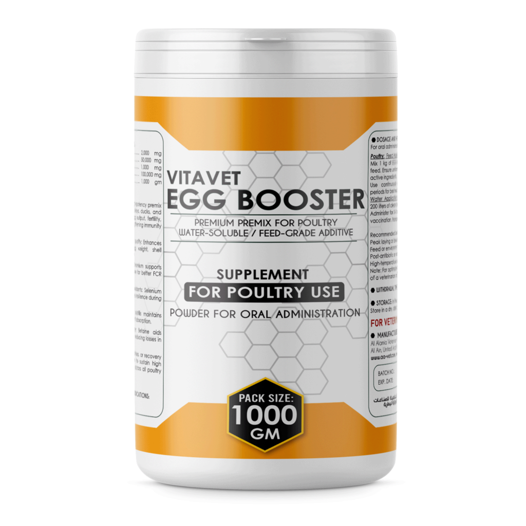 VITAVET EGG BOOSTER is a high-potency premix for layers, breeders, broilers, turkeys, ducks, and quails, formulated to boost egg output, fertility, and feed efficiency while strengthening immunity and stress resistance.