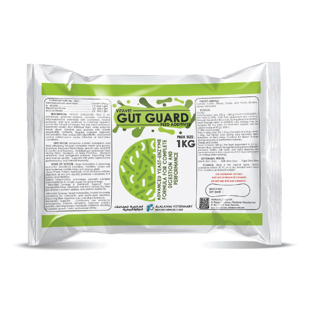 VITAVET GUTGUARD PLUS is an advanced probiotic-enzyme complex combining Saccharomyces cerevisiae with α-amylase, neutral protease, and acid protease to maximize digestion across the full gut pH range. The live yeast enhances beneficial rumen and intestinal flora, while enzymes break down starches and proteins into readily absorbable nutrients. Regular inclusion improves fermentation, fiber and protein digestibility, and overall animal performance under intensive or heat-stress conditions.