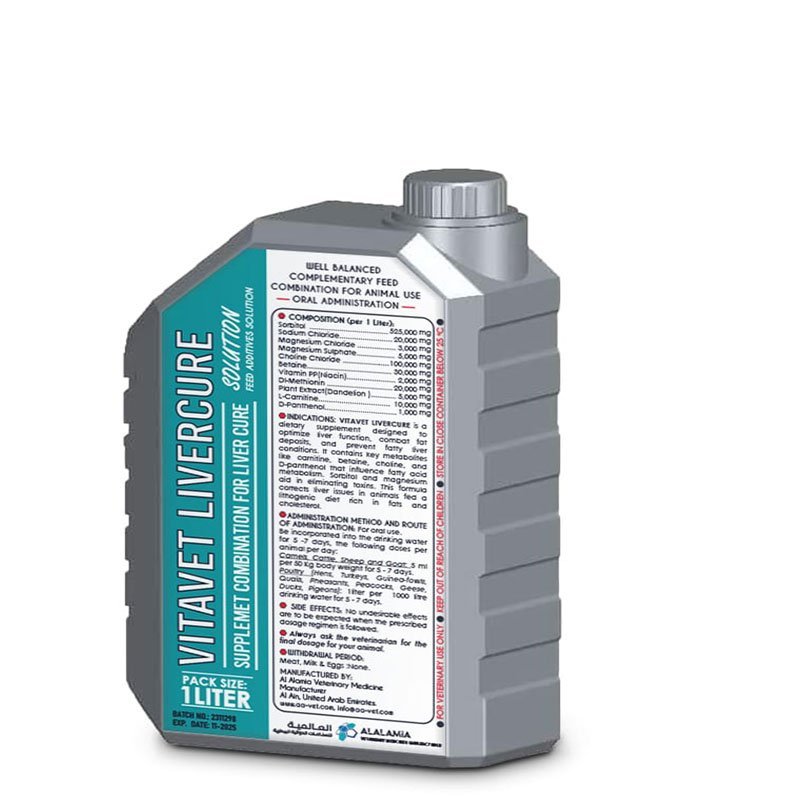 1,000 mg **Indications:** VITAVET LIVERCURE is a dietary supplement designed to improve liver function, combat fat accumulation, and prevent fatty liver conditions.