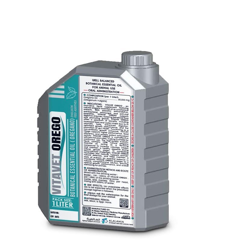 **VITAVET OREGO** *Balanced Plant Oil for Animal Use* *Oral Administration* **Package Size:** 1 liter **Manufactured by:** Arabian Veterinary Industrial Company Al Ain, United Arab Emirates [www.aa-vet.com](http://www.aa-vet.com), info@aa-vet.com **Batch Number:** **Expiration Date:** **Composition (per 1 liter):** – Oregano Oil …..